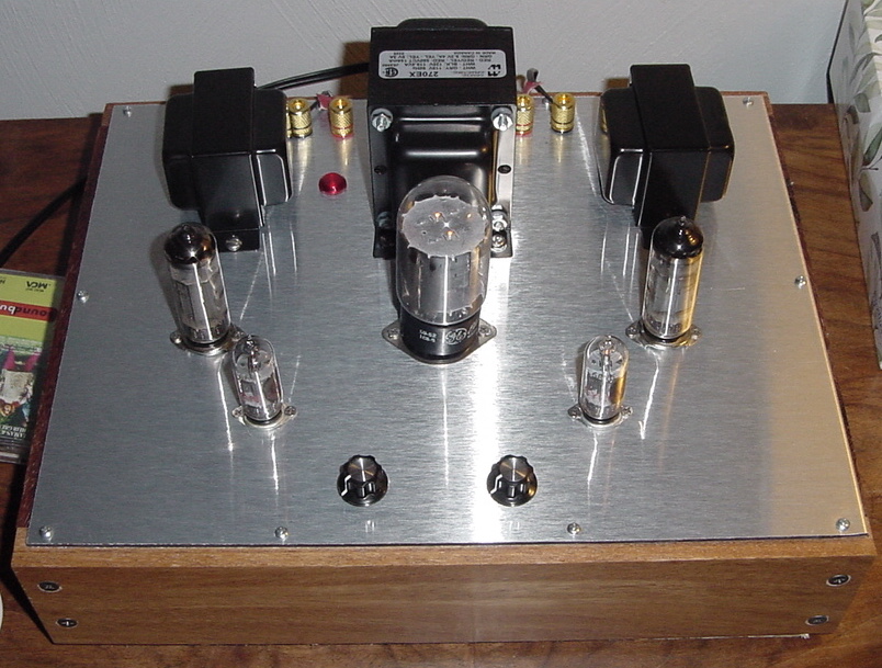 12AY7 input and 12AX7 driver/phase inverter. It has a 16 ohm