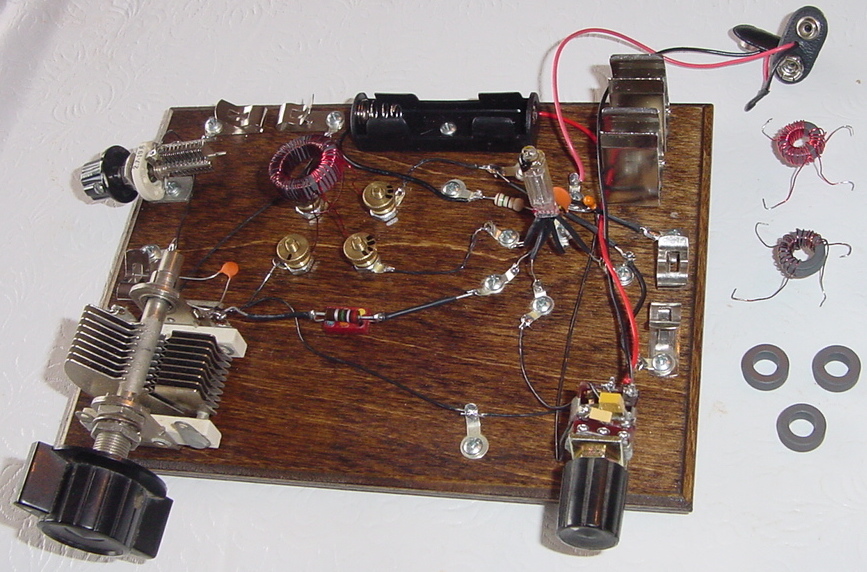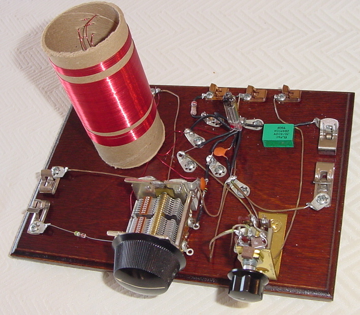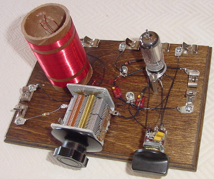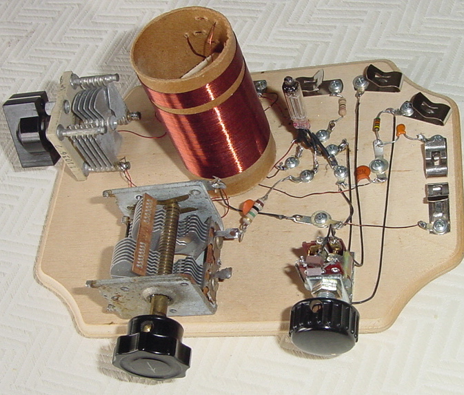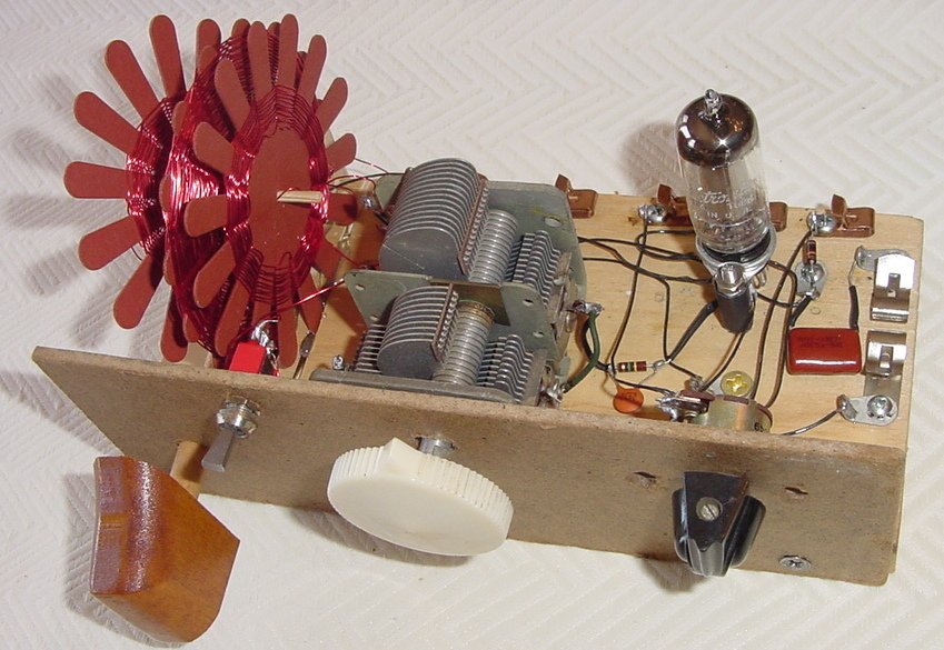 Homebuilt AM band regenerative radio using 1S4 tube and spider web
